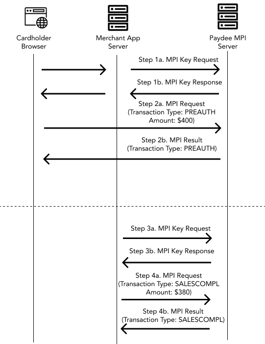 At times, the final amount may be undefined and unknown. One such use case is a tour package where travellers may easily exceed the base tour package amount. Merchants may pre-authorized (PREAUTH) the transaction with a pre-agreed amount plus typical additional service chages before completing the transaction with a Sales Complete (SALESCOMPL).
